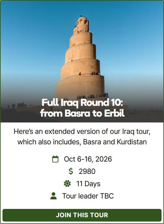 This tour starts in Basra, which means that we’ll travel across the whole country, from the very south of the country to the Kurdish lands in the north over 11 days, visiting highlights like the Mesopotamian Marshes, Karbala, Babylon, Baghdad, Mosul, Lalish, Erbil and more.